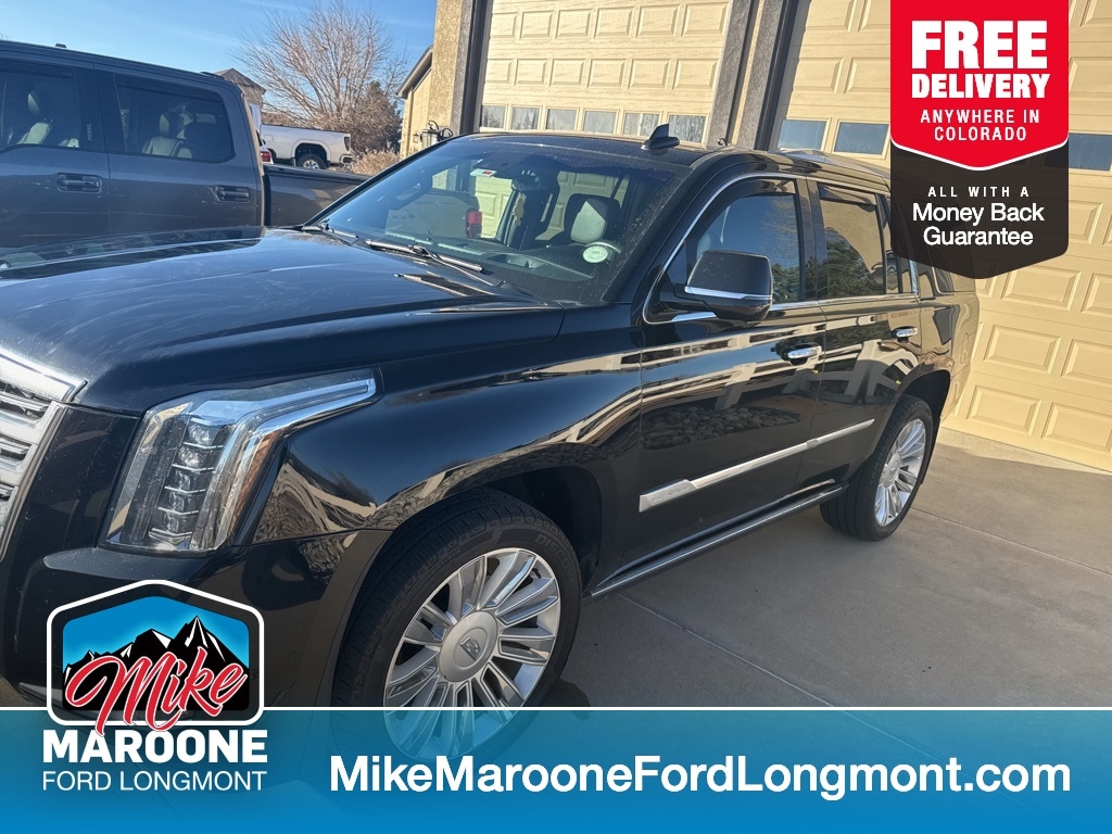 Recent Arrival at Mike Maroone Ford! Clean CARFAX. CARFAX One-Owner. FREE DELIVERY ANYWHERE IN COLORADO, LOCAL TRADE, RARE FIND!!!, 2017 Cadillac Escalade Platinum 4WD,Platinum Exterior: Black Raven Interior: Jet Black, Platinum Trim Standard Features (Highlights) Platinum models are fully loaded from the factory and include almost every available Escalade feature as standard, including: Power retractable assist steps Premium leather seating surfaces Heated & ventilated front seats Heated second-row bucket seats 3rd row power-folding seats Premium Sueded Headliner Leather-wrapped instrument panel & console Head-up display Rear Camera Mirror Surround Vision 360 cameras Safety Alert Seat Adaptive Cruise Control Forward Collision Alert Lane Keep Assist Blind Zone & Rear Cross Traffic Alert Tri-zone climate control Hands-free power liftgate Wireless charging 16-speaker Bose Centerpoint Surround System Power tilt/telescoping steering wheel Navigation with 8" CUE touch screen Rear-seat entertainment system with dual screens Refrigerated center console Magnetic Ride Control suspension Power sunroof, Appearance & Exterior Black Raven Exterior Paint (GBA) 22" 7-Spoke Split Chrome Alloy Wheels (SEU) Chrome Exhaust Tip (VQZ) Mechanical & Performance 6.2L V8 with VVT & Direct Injection (L86) 8-Speed Automatic Transmission (M5U) 3.23 Rear Axle Ratio (GU5) Packages & Technology 1SD Platinum Preferred Equipment Group (Full Platinum luxury, technology, comfort, safety & entertainment suite) Interior & Comfort Features Refrigerated Center Console (included in Platinum) Premium Leather Seating Semi-Aniline Sueded Microfiber Headliner (AT6) Additional Options Front License Plate Bracket (VK3) Second-row power assist fold & tumble Fold-flat 3rd row seating, Experience the ultimate full-size luxury SUV with this 2017 Cadillac Escalade Platinum 4WD, finished in stunning Black Raven over a Jet Black premium interior. As Cadillacs flagship trim, the Platinum edition takes every feature of the Escalade and elevates it with hand-crafted materials, top-tier technology, and a driving experience unlike anything else on the road. Under the hood, a powerful 6.2L V8 pairs with an 8-speed automatic transmission for smooth, confident acceleration and impressive towing capability. Magnetic Ride Control suspension adjusts in real time for a refined and controlled ride, whether cruising the highway or navigating Colorados mountain roads. Inside, the Platinum cabin surrounds you with semi-aniline premium leather, a sueded microfiber headliner, heated and ventilated front seats, heated rear seats, and a refrigerated center console signature features exclusive to the Platinum trim. Rear passengers enjoy dual entertainment screens, wireless headphones, and abundant legroom. Technology highlights include the 360 Surround Vision camera system, Head-Up Display, Rear Camera Mirror, adaptive cruise control, lane keep assist, blind zone alert, and a powerful 16-speaker Bose Centerpoint sound system. The hands-free liftgate, power-folding third row, and spacious cargo area make this Escalade as functional as it is luxurious. With its bold 22-inch chrome wheels, iconic LED lighting signature, and commanding road presence, this Escalade Platinum stands out in every setting luxury, performance, comfort, and technology all in one. If you're looking for a fully loaded, top-of-the-line Escalade with every major option, the Platinum trim is the one to own. Hard to find in this condition and color combination don't miss it.. Odometer is 51967 miles below market average! Black Raven 2017 Cadillac Escalade Platinum Edition 4D Sport Utility 6.2L Variable Valve Timing V8 SIDI 8-Speed Automatic 4WD