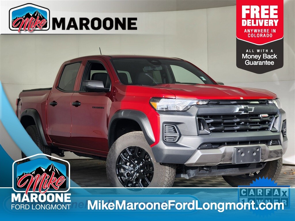 Recent Arrival at Mike Maroone Ford! Clean CARFAX. CARFAX One-Owner. FREE DELIVERY ANYWHERE IN COLORADO, BLUE CERTIFIED, 4 WHEEL DRIVE, NAVIGATION, LIFTED - OVERSIZED WHEELS AND TIRES, REAR BACKUP CAMERA, LOCAL TRADE, Trail Boss Convenience Package II, steering wheel wrapped, wireless charging, heated steering wheel, remote vehicle start, 8-way power driver seat adjuster, driver and front passenger heated seats, Jet Black Evotex up-level power lumbar, driver seat technology package, Radiant Red Tintcoat, HD Surround Vision, rear pedestrian alert, adaptive cruise control. Radiant Red Tintcoat 2025 Chevrolet Colorado Trail Boss 4D Crew Cab 2.7L I4 Turbocharged DOHC 16V LEV3-ULEV50 310hp 8-Speed Automatic 4WD