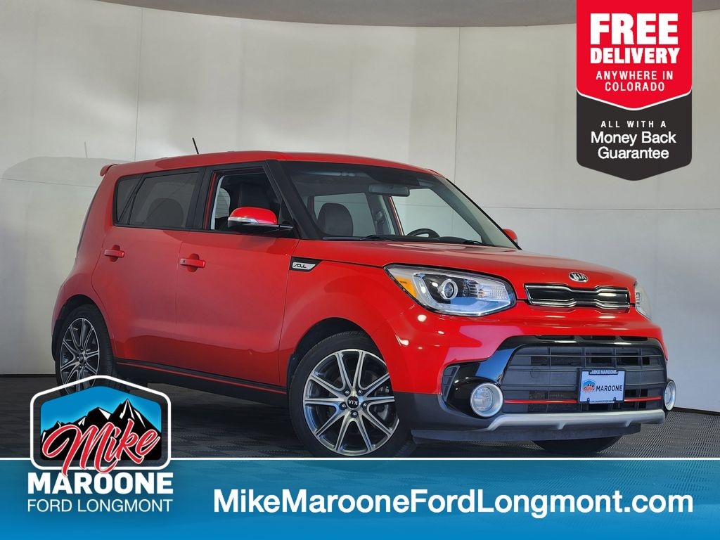 FREE DELIVERY ANYWHERE IN COLORADO, 2018 Kia Soul + (Plus), Inferno Red Exterior, Black Interior, 1.6L Turbo GDI 4-Cylinder Engine, 7-Speed Dual-Clutch Automatic Transmission, Front-Wheel Drive, Technology Package, 18-Inch Alloy Wheels, Navigation System with 8-Inch Touchscreen, Harman/Kardon Premium Audio System, Apple CarPlay and Android Auto, Bluetooth Connectivity, SiriusXM Radio, HD Radio, Rearview Camera, Blind Spot Detection, Heated Front Seats, Heated Rear Outboard Seats, Heated Steering Wheel, Power Drivers Seat with Lumbar Support, Power Folding Heated Side Mirrors, LED Positioning Lights, LED Taillights, Automatic Climate Control, Push Button Start with Smart Key, Cruise Control, Leather-Wrapped Steering Wheel with Audio Controls, 60/40 Split Folding Rear Seats, Cargo Cover, Cargo Net, Fog Lights, Privacy Glass, Traction Control, Electronic Stability Control, Vehicle Stability Management, Hill-Start Assist Control, 4-Wheel Anti-Lock Brakes, Tire Pressure Monitoring System, LATCH Child Safety System, 10-Year/100,000-Mile Powertrain Warranty (when new).. Inferno Red 2018 Kia Soul Exclaim 4D Hatchback I4 7-Speed Automatic FWD